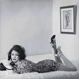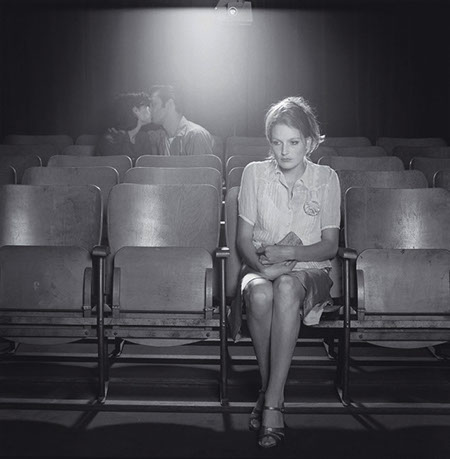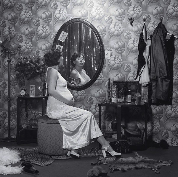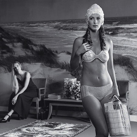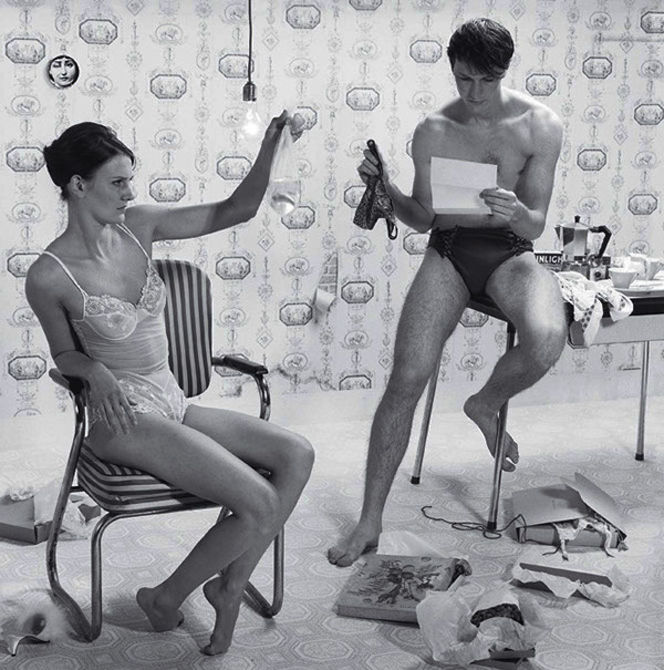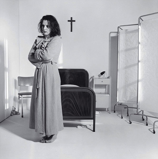 Embodied in a series of staged photographs, this series places photographic and cinematographic clichés and conventions in a different order to create new images. The studio becomes, by artifice, fake rooms (bedrooms, living rooms, waiting rooms,…) in which one or more models act out a role. Eye contact between the model and the spectator is denied, occasioning a dislocation of rapport. This in turn engenders an intangibility that needs to be imagined by the spectator. Song text engraved in glass, however, can limit the choices available to the observer. Once again, personal interpretation of the text is perhaps the route to appreciation.